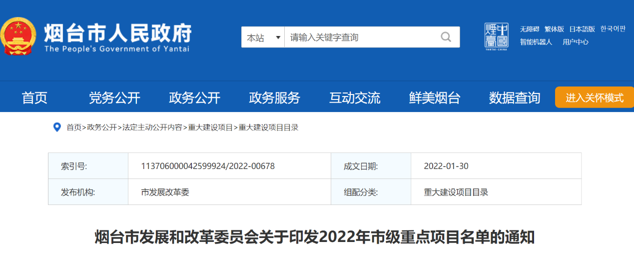 該項目已於2021年12月由煙台市生態環境局(jú)進行環評受理。