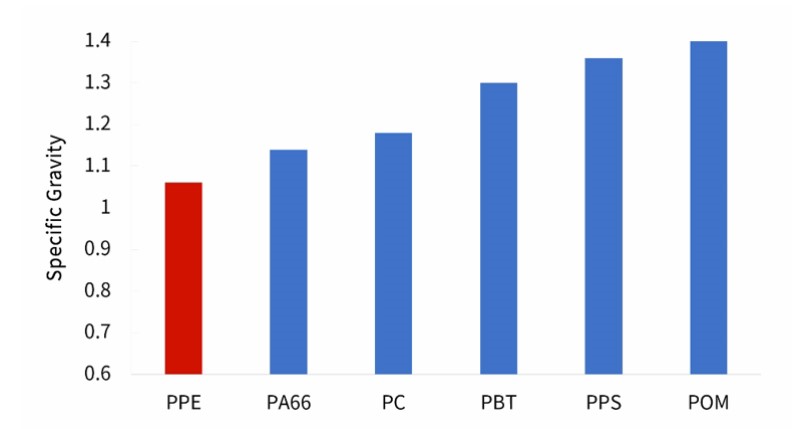 1、比重低,ρ=1.06 g/cm3,最輕的工程塑料。