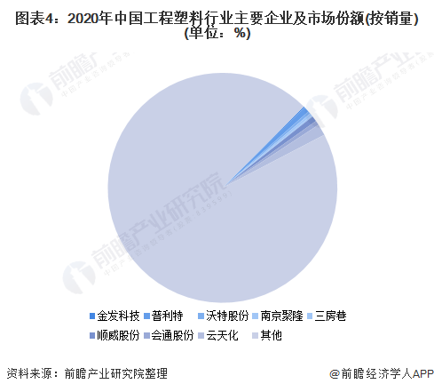 從(cóng)市場份額來(lái)看(kàn),我(wǒ)國工程塑料行業代表(biǎo)企業市(shì)場份額普遍較小。根據中國塑料工業協會披露數據,2020年,中國工程塑料(liào)需求量達627萬噸,較上年增長37萬噸。根據上市公司披露的工程塑料業務銷量情況進行測算,雲天化、普(pǔ)利特、順威股份(fèn)市場份額分別達約1.6%、0.8%與0.8%。