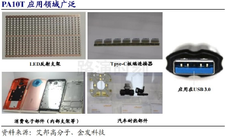 PA10綜合性能優越,可廣泛應用於汽車、電子電器、航空航天、LED、和化工、水暖等領域。