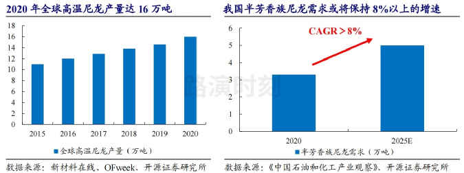 據Ofweek數據,2020年全球高溫尼龍產量約為16萬(wàn)噸,5年複合增速7.78%。據《中國石油和化工產業觀察》數據,國外半芳香族尼(ní)龍產能(néng)超過15萬噸/年,國內產能約為1.6萬噸/年。我國2016-2020年對半芳(fāng)香族尼龍需求增(zēng)速超(chāo)過10%,2020年需求量達3.3萬噸,其中,電子和汽車消費市占占比高達(dá)85%以上,電子(zǐ)行業快速發展和汽車領域高溫尼龍滲透率(lǜ)的提高是帶動其(qí)需求(qiú)增(zēng)長的主要動力。據《中國石油和化工產業觀(guān)察》預測,未來5年我國對半芳香族尼龍的需求將保持8%以上的增速,至2025年將達5萬(wàn)噸,包括PA10T在內的各類半芳香族高溫尼龍(lóng)產品有較好的發展前景。