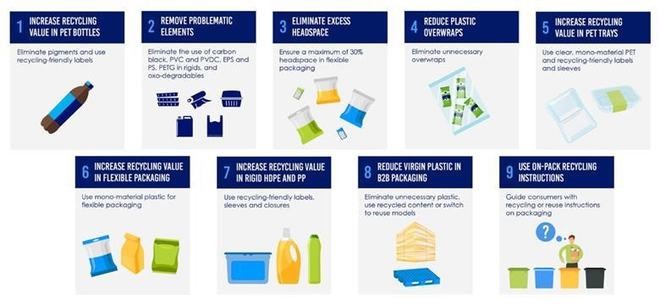 CGF(消費品論壇Consumer Goods Forum)於(yú)2021年7月發布了9條《黃金設計原則》指南細則,旨在加快推進“使用更少(shǎo)的塑料、更好(hǎo)的(de)塑料”的進程,去除塑料在回收再生(shēng)環節中的不利因素,實現塑料循環經濟(jì),100%可回收再生(shēng)。