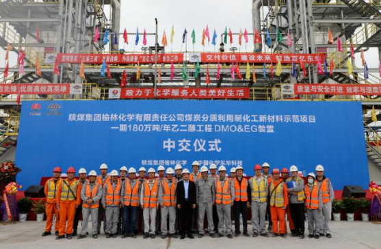 4月28日,中國化學所屬東華公司(sī)總承包(E+PC)的(de)陝煤(méi)集團榆林化學有限責任公司煤炭分質利用製化工新材料示範項目一期180萬噸(dūn)/年乙二醇工(gōng)程乙二醇(chún)裝置項(xiàng)目舉行中交儀式。