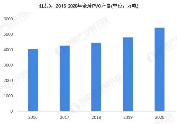 2016-2020年全(quán)球PVC產量總體呈上升趨勢。根據Bloomberg的統計,中國PVC產量(liàng)占全球產量的42%,據(jù)此(cǐ)測算2020全球PVC產量為5431萬噸(dūn)。