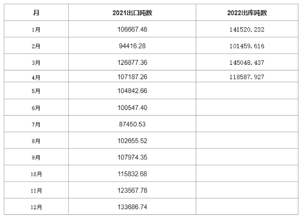 據海關數據顯(xiǎn)示,2022年(nián)4月鈦白粉出口為(wéi)11.86萬噸,環比減少18.24%,同比則增長10.64%。2022年(nián)累計出口達50.66萬噸,年度同比增加16.42%。