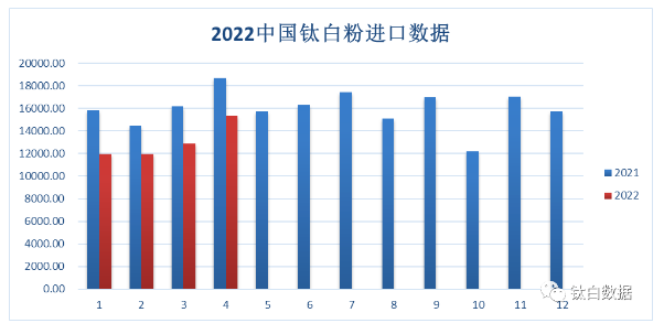 2022年4月鈦白粉進口為1.54萬噸,同比減少17.99%,環比增長19.42%。年累(lèi)計進口5.21萬噸,年(nián)度同比減少20%。