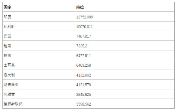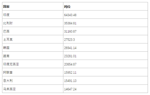 在出口國家地區上麵,前三是印度、比利時和巴西,下表(biǎo)是年(nián)度出口(kǒu)前10國家: