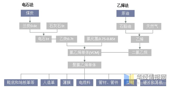 PVC生產工藝主(zhǔ)要為“電石法”和“乙烯法”,其原材料分別為煤炭和原油。全球絕大部分(fèn)國家采用石油天然氣路線。由於中國貧油富煤(méi),我國PVC生產工藝以電石法為主(zhǔ)。