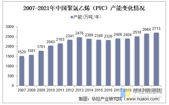 隨著國民經濟的迅速發展,我國(guó)PVC產能在快速提升。2007年以來,我國PVC產能總體(tǐ)上呈增長趨勢。據中國氯堿工業協會數據,2021年,中國(guó)聚氯乙烯(PVC)總產能達2713萬噸/年,較2020年提(tí)升49萬噸/年。