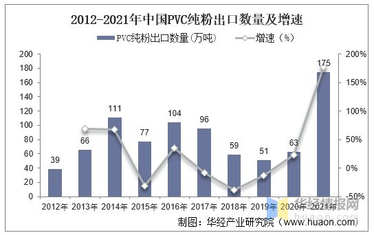 2021年,受(shòu)國外貨源供應緊張且價格持續上漲支撐,中(zhōng)國PVC出口量明顯增加,但遠洋運力緊張的矛盾在下半年較為突出,限製(zhì)中國PVC出口量的進一步增長(zhǎng)。數據顯示,2021年全年,我國PVC純粉累計出口數量達175.4萬噸,同比上升177.8%。