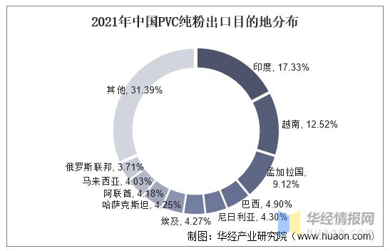 從(cóng)出口目的(de)地(dì)來看,我(wǒ)國PVC純粉產品主要出口南(nán)亞、東南(nán)亞(yà)以(yǐ)及中亞的部分地區,印度仍是(shì)中國PVC純粉出口的主要目的地,2021年全年,中國出口(kǒu)至(zhì)印度的PVC純粉達到30.4萬噸,占中國出口總量的17.33%;出口至越南的PVC純粉22萬噸,占比(bǐ)12.5%;出口至孟加拉國的PvC純粉16萬噸,占比9.1%。