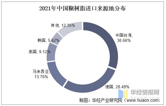 2021年(nián)我國累計進(jìn)口糊樹脂8.46萬噸,國內糊樹脂主要從中國台灣、德(dé)國、馬來西亞等地進口,2021年的占比分(fèn)別為30.66%、28.49%、13.76%。