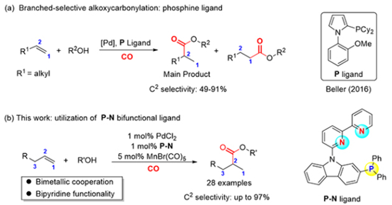 烷氧(yǎng)羰基化反應是製備酯類化合物(wù)的重要方法。通常,烷氧(yǎng)羰基化反應是以過渡金(jīn)屬為催化劑(如(rú)鈀配合(hé)物),以烯烴為原料、一氧化碳為(wéi)羰源、醇為氫源和親核試劑反應製備酯類產物的過程(chéng),具有產物價值高、原子經濟性(xìng)好等優點。