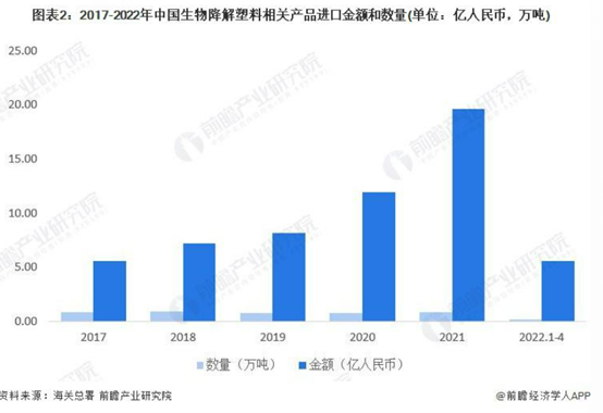 2022 年 1-4 月,我國生物降解塑(sù)料相關產(chǎn)品的進口(kǒu)金額約為 5.61 億元,同比增長 18.02%; 進口量達 0.21 萬噸,同比下降 9.03%。