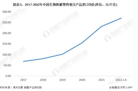 根據海關(guān)總署查詢,我(wǒ)國生物降解塑料相關產品的進口均(jun1)價自 2017 年以來呈現快速上漲的態勢,2021 年我(wǒ)國生物降解塑料相關產品的進口均(jun1)價為 154.47 元 / 千克,2021 年我國生物降解塑料相關(guān)產品的進口均價上漲到 231.14 元 / 千克,同(tóng)比增長 49.63%;2022 年 1-4 月,我國生物降解塑料相關(guān)產品的進口均價更是上漲至 270.29 元 / 千克。生物降解塑料相關產品進口均價上漲幅(fú)度較大,行業企業應該謹慎防範進(jìn)口風險。