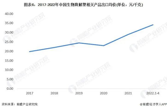 根據海關總(zǒng)署(shǔ)查詢,我國生(shēng)物降(jiàng)解塑料相關(guān)產品(pǐn)的出口金額較進口金額(é)低,由此看來我國的相關生物降解塑料(liào)產品的附(fù)加值普(pǔ)遍較低。2021 年我(wǒ)國生物降解塑料相關產品的出口均價(jià)為 28.94 元 / 千克,2022 年 1-4 月則為 34.16 元 / 千克,存在(zài)小幅度上漲的現象,但較進口均價來看,我國生物降解塑料相關產品的出口均價仍處於較低水平。