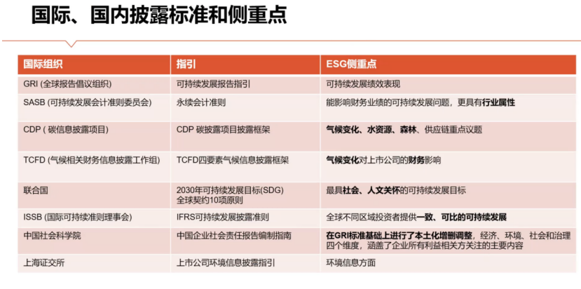 高楊:關(guān)於ESG的報告和披露,國際上和國內的準則和規則有很多,從披露的(de)角度來看,哪些依據是必須要遵從的?以及在披露過程中會有哪些主要的模塊和內容?尺度又該如何去界定(dìng)和把(bǎ)握?