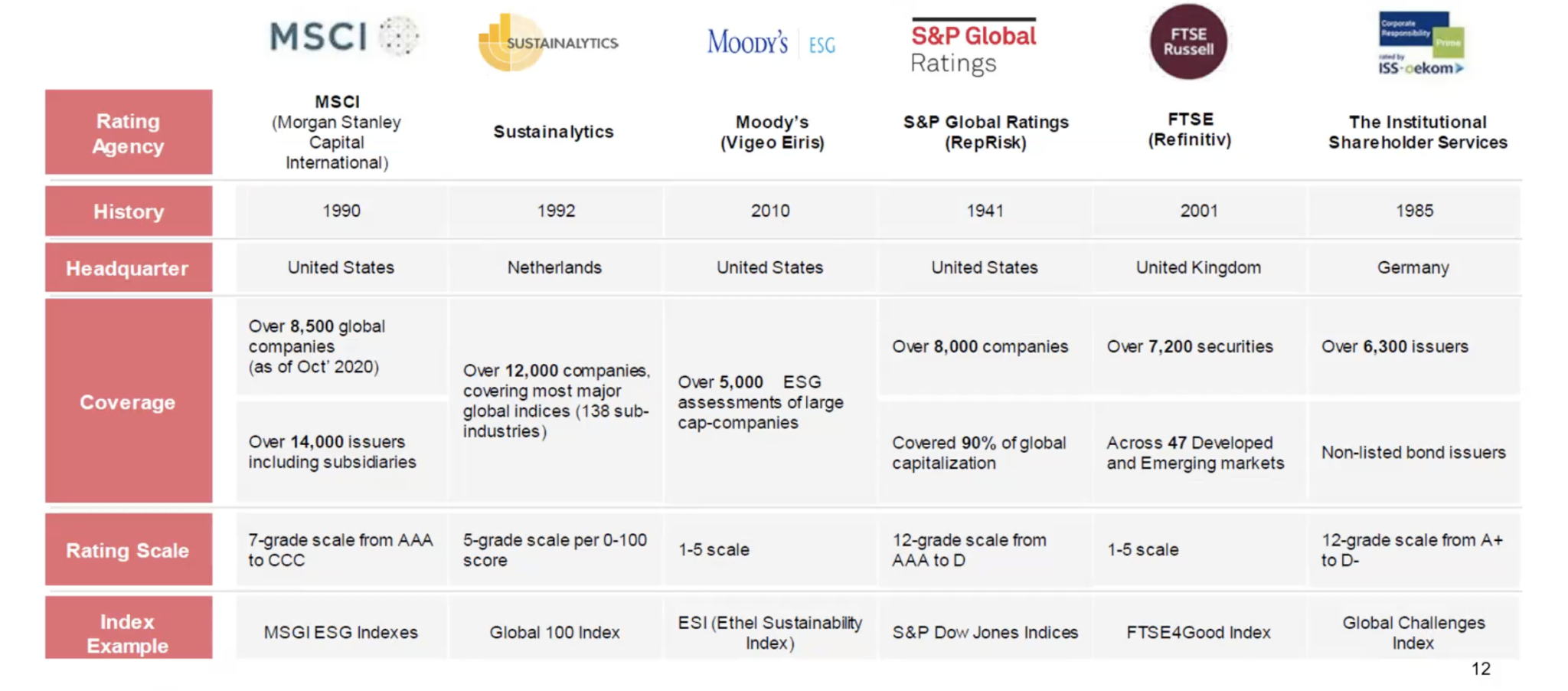 可以看到,頭部的評級機構並(bìng)不少,左(zuǒ)邊五家評級機構大家都(dōu)可以做一些初步的了解。MSCI是全球最有影響力的,且其背靠華爾街,從某種程度上代表(biǎo)了很多頂流的投資機構,其報告披露的質量以及信息收集的完整性都是作為一個較強風(fēng)向標(biāo)的存在。美國的MSCI的指數基(jī)金,它(tā)也在表達全球市場比較關注的一些真正做(zuò)的好的企業,並推薦給更多的投資機(jī)構。與此同時,歐洲的SUSTAINALYTICS也很重要,它(tā)的覆蓋麵很廣,含括12000家企業,其信息披露在某種程度上(shàng)也要比MSCI配置更全(quán),能從更重要的(de)一些角度給出一個相對來說更具備參考性的管理方式。MODDY’S和S&P以及FTSE等一些評級機構都側重在不同的市場,有自身的特(tè)點。
