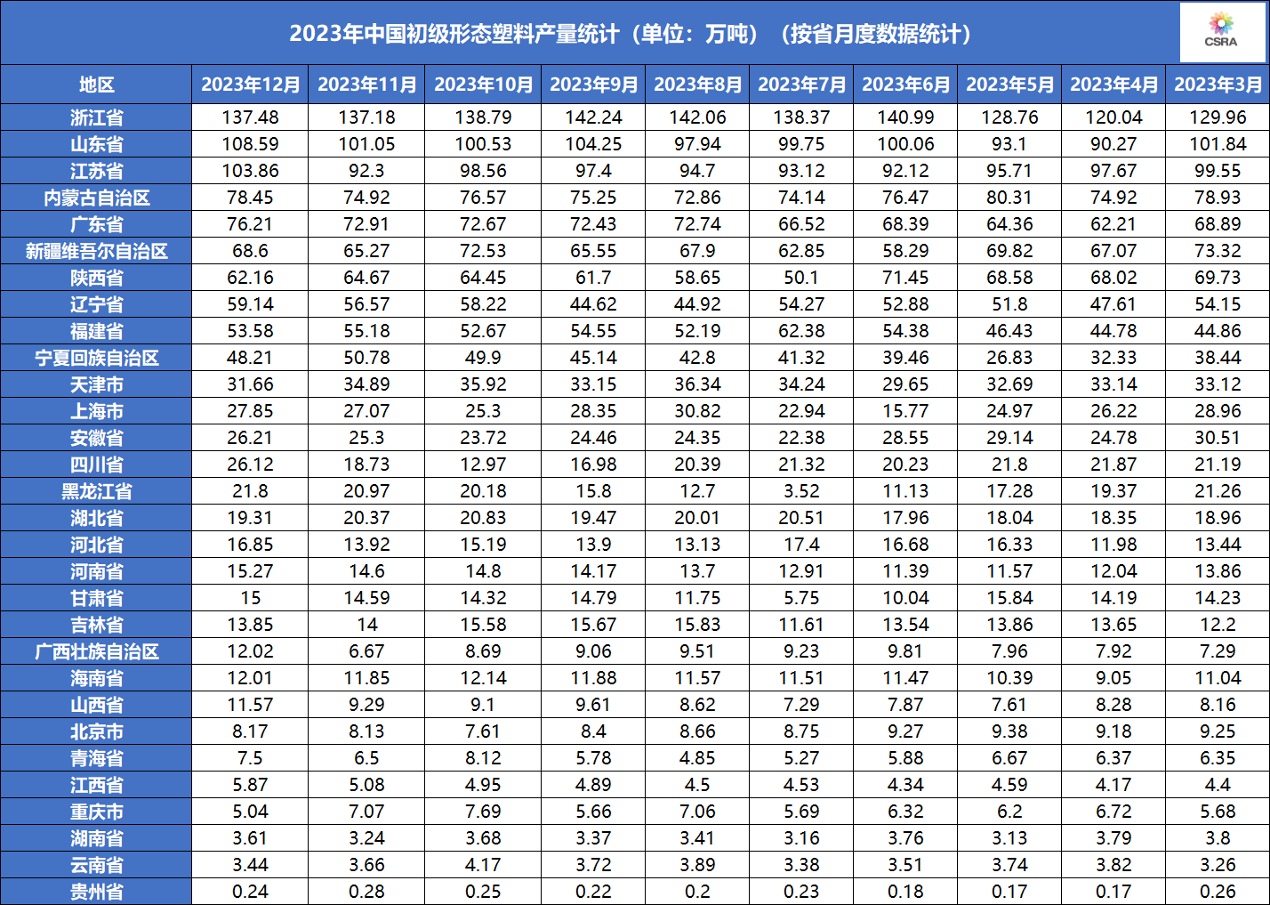 從省份來看,2023年12月產量前三地區的為:浙江省137.48萬噸,山東省108.59萬(wàn)噸,江蘇省103.86萬噸。