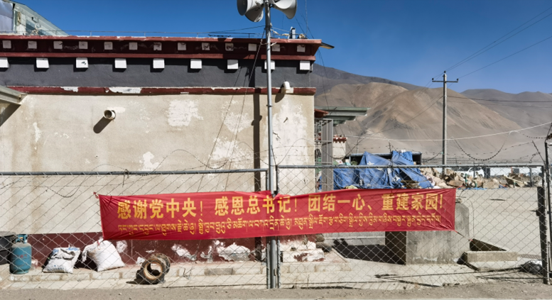 在嘎旦村黨群(qún)服(fú)務中心外,“感謝黨中央!感(gǎn)恩總書記!團結一心、重建家園!”的橫幅在(zài)風中獵獵(liè)作響。村黨支部書記吳堅加布、村委會主(zhǔ)任頓珠正帶(dài)人搬運(yùn)礦泉水等救災物資。記者尋到現(xiàn)場時,看到他們眼睛裏都布滿血絲。