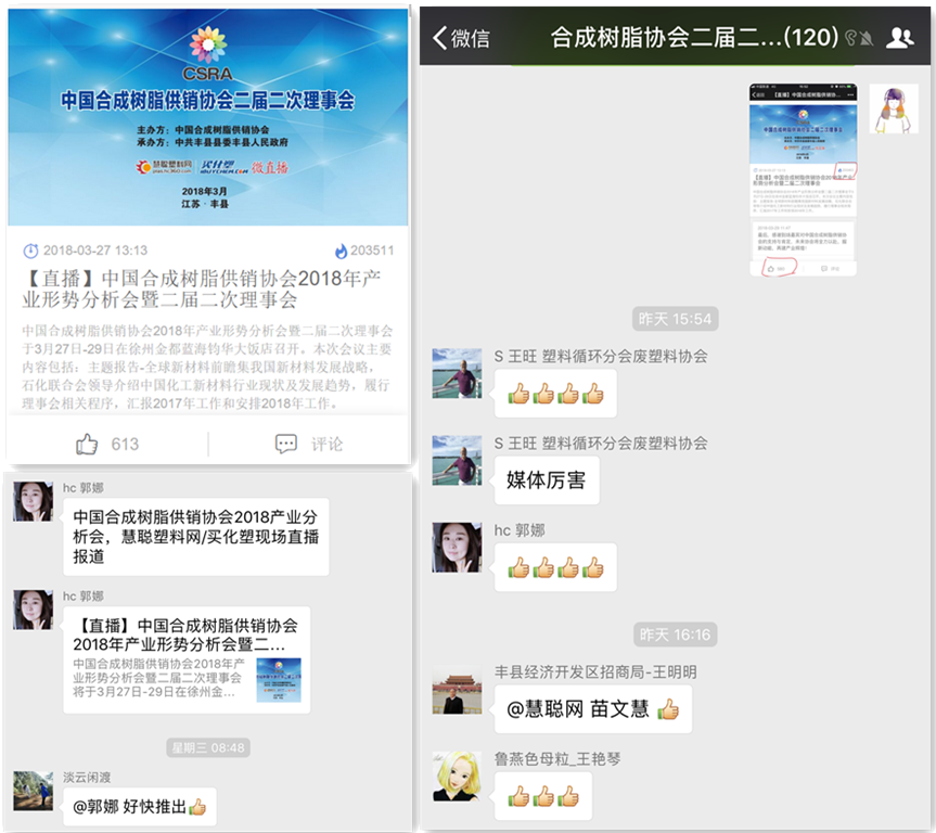 慧聰塑料網/買化塑作為中國草莓污视频樹脂供銷協會(huì)理事單位,也應邀出席本次會議。並以提高(gāo)協會影(yǐng)響力(lì)為宗旨,對會議全程做現場微直播,累計瀏覽量高達20餘萬,點讚600餘人。