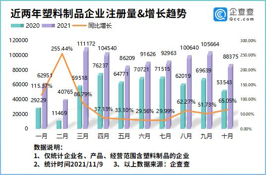 企查查數據顯示,2021年前10月我(wǒ)國新增塑料製品企業88.49萬家,同比增長35.74%。最近(jìn)的10月,我國(guó)新增塑料製品企業8.83萬家,同比增長65.05%。9月新增10.56萬家,同比增長51.73%。