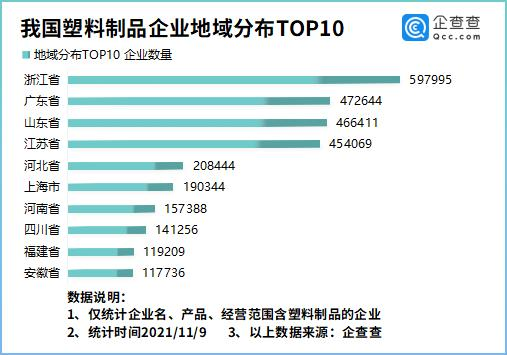 企查查數據顯示,從(cóng)地域分布來(lái)看,浙江以59.79萬家塑料製品企業排名第一,廣東省、山東省分別有47.26萬家、46.64萬家塑料製(zhì)品企業,排在第二、三名。此後依次為江蘇省、河北省、上海市等。