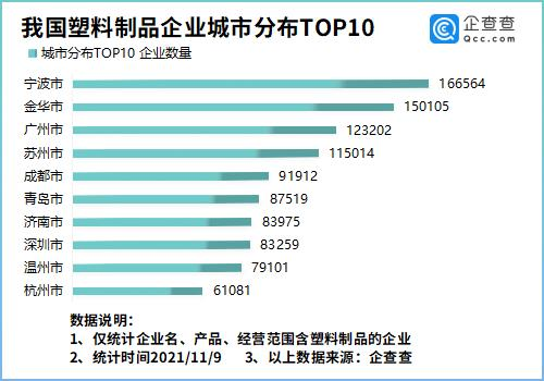 企查查數據(jù)顯示,從城市分布來看,寧波位居榜首,有16.65萬家塑(sù)料製品企業。金華、廣州分別有塑料製品企業15.01萬家、12.32萬家,位居前三。此後依(yī)次為蘇州市、成都(dōu)市、青島市等。