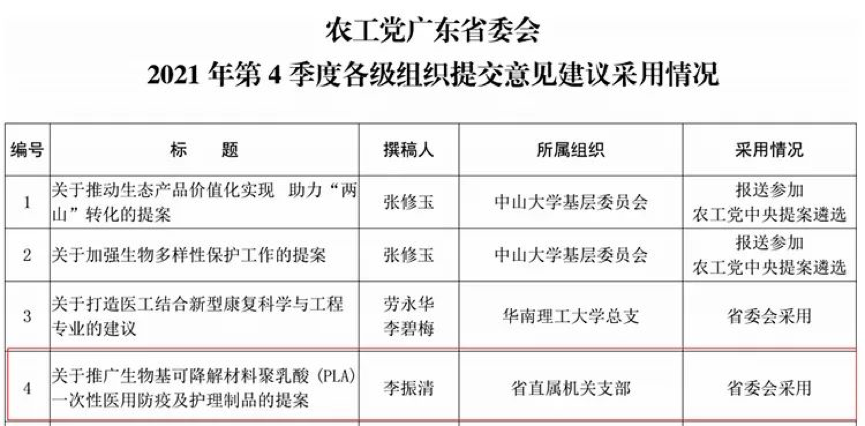 生物降解材料研究院報道,農工黨廣(guǎng)東省委員會機關支部委員、廣東省醫養融合平台組委會(huì)主(zhǔ)委、廣東(dōng)省養老(lǎo)服務產業促進會會長、廣東聚乳酸供應鏈組委會所提交的《關於推廣(guǎng)生物(wù)基可降(jiàng)解(jiě)材料聚(jù)乳酸(PLA)一次性醫(yī)用防疫及護理製品的提案》被廣東省委會采用,並有效(xiào)實現(xiàn)了(le)成果轉換,推出了係列“食布同源”醫用防護及護理製品(pǐn)。