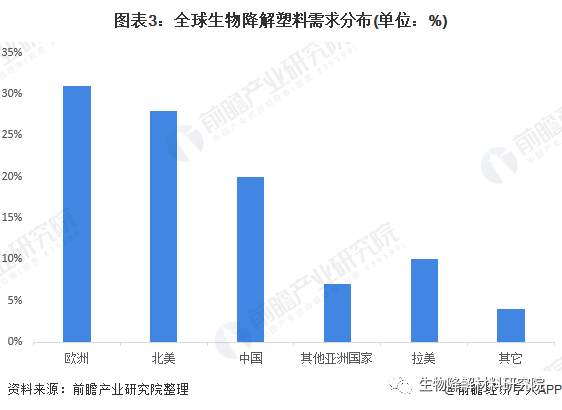 歐洲生物降解塑料市場快(kuài)速發展(zhǎn)主(zhǔ)要得益於歐洲相關法律(lǜ)法規支持。全球生物降解塑(sù)料需求量中,歐洲(zhōu)的需求量最大,占(zhàn)比達31%,北美和中國占比分別為28%和20%。