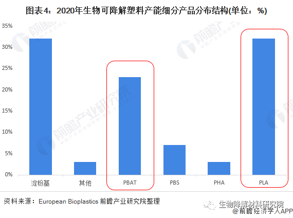 European Bioplastics (歐洲生物塑料協會(huì))認為2020年,在全球可生物降解的產能中,生物基塑料-可生物降解代表中PLA(聚乳酸)和澱粉基塑料的產能占比(bǐ)最大,均為32%。石油基塑料-可生(shēng)物降解代表中PBAT的產能(néng)占比最大,為23%。