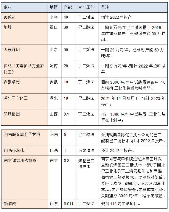 表 國內擬在建己二腈產能投產計劃