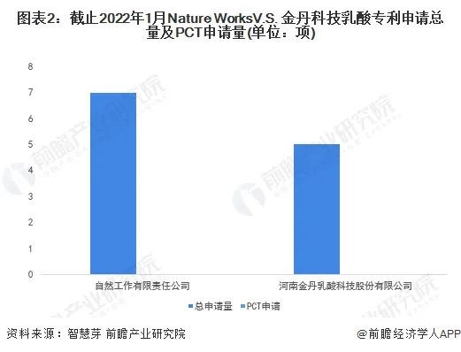 在乳酸(suān)專利申請量方(fāng)麵,Nature Works乳酸專利申請總量領先,達到7項,且PCT專利(lì)申(shēn)請為0項;金丹科技乳酸專利申請(qǐng)總量為(wéi)5項,PCT專利申請為0項。