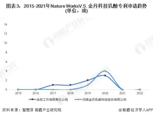 從趨勢(shì)上看,2015-2019年,Nature Works在乳酸領域專(zhuān)利(lì)申請量每年均比金丹科技多,2019年,Nature Works乳酸專利申請量為2 項,金丹科技有1項。2020年,金丹科技乳酸專利申請量為4項,Nature Works乳酸專利申請量為3項。