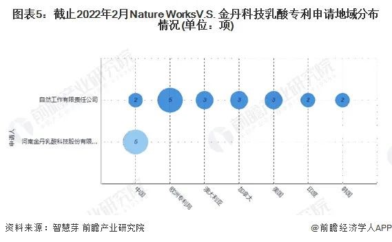 目前,金丹科技的乳酸專利申請(qǐng)區域主要集中在中國,其乳酸專(zhuān)利數量為5項;Nature Works乳酸專利(lì)申請(qǐng)區域分布在全球各(gè)地,但是在歐洲區域更加(jiā)多,其乳酸專利數量為5項。