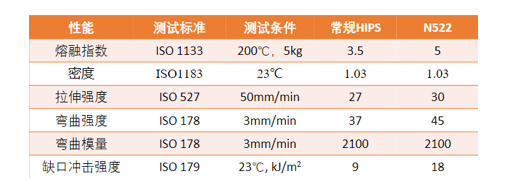 比起傳統HIPS,N522熔指更高,加(jiā)工窗口寬,成型周期(qī)短,當市場需求暴增的時候,N522能更快(kuài)搶占市場。