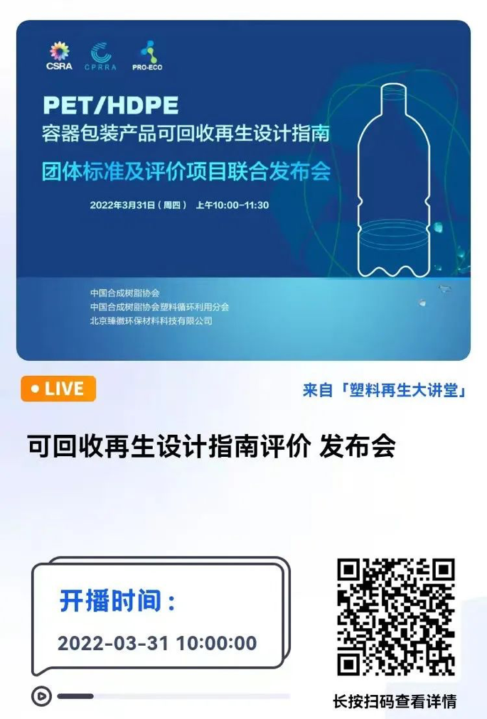 “PET、HDPE容(róng)器包裝產(chǎn)品可回收再生設(shè)計指南團體標準暨(jì)可回收再生設計評價(jià)項目聯合發布會”將於2022年3月31日上午(wǔ)10:00-11:30在線上舉行,敬請關注!