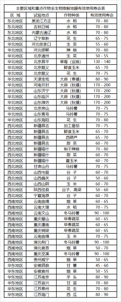 主要區域和重點作(zuò)物全生物降解地膜有(yǒu)效使用壽命表: